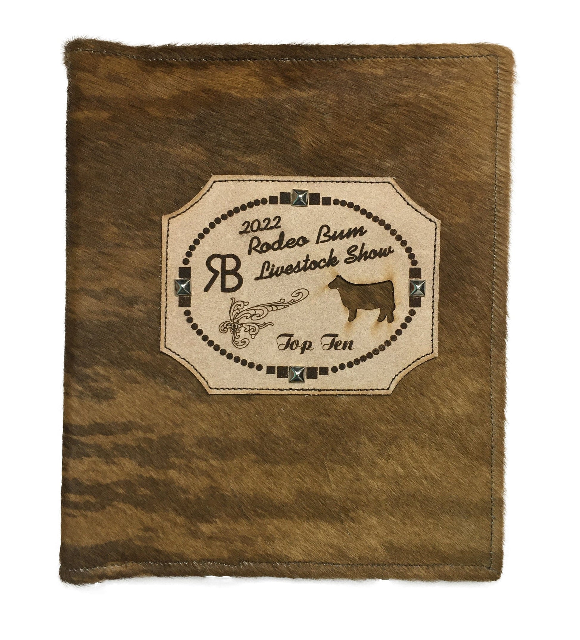 Cowhide binder with custom designed lasered leather patch.