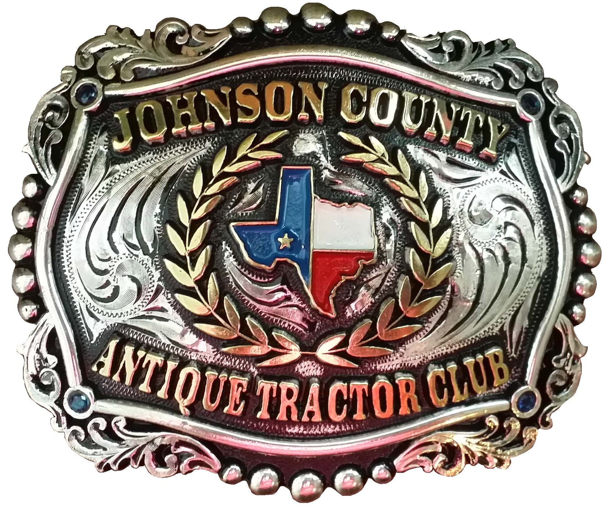 Custom buckle includes silver swirl and bead design at the edge.  Gold lettering, and custom logo in the center.