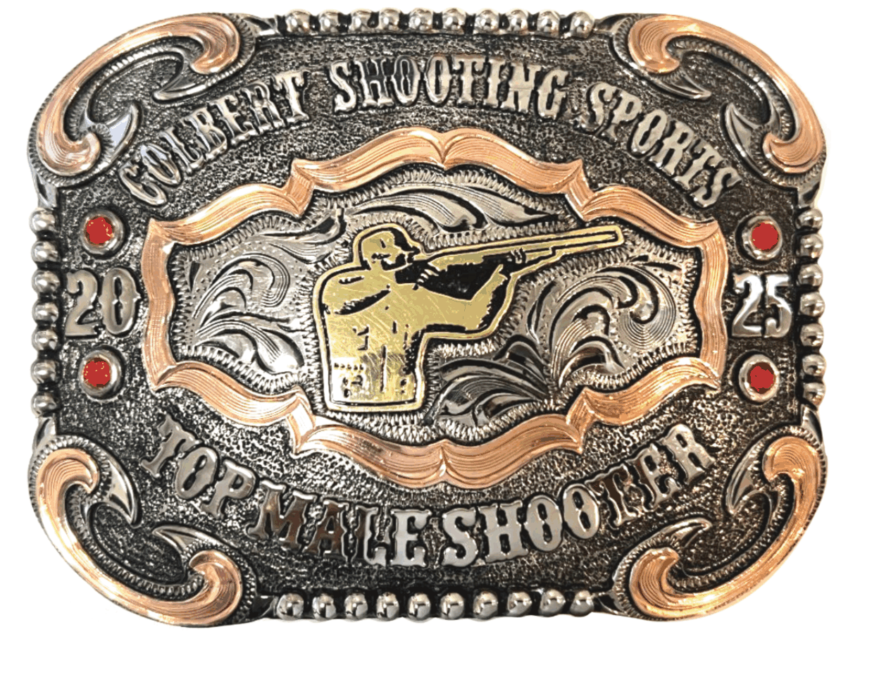 Black background with copper accents and red stones. Silver and gold lettering and motif.