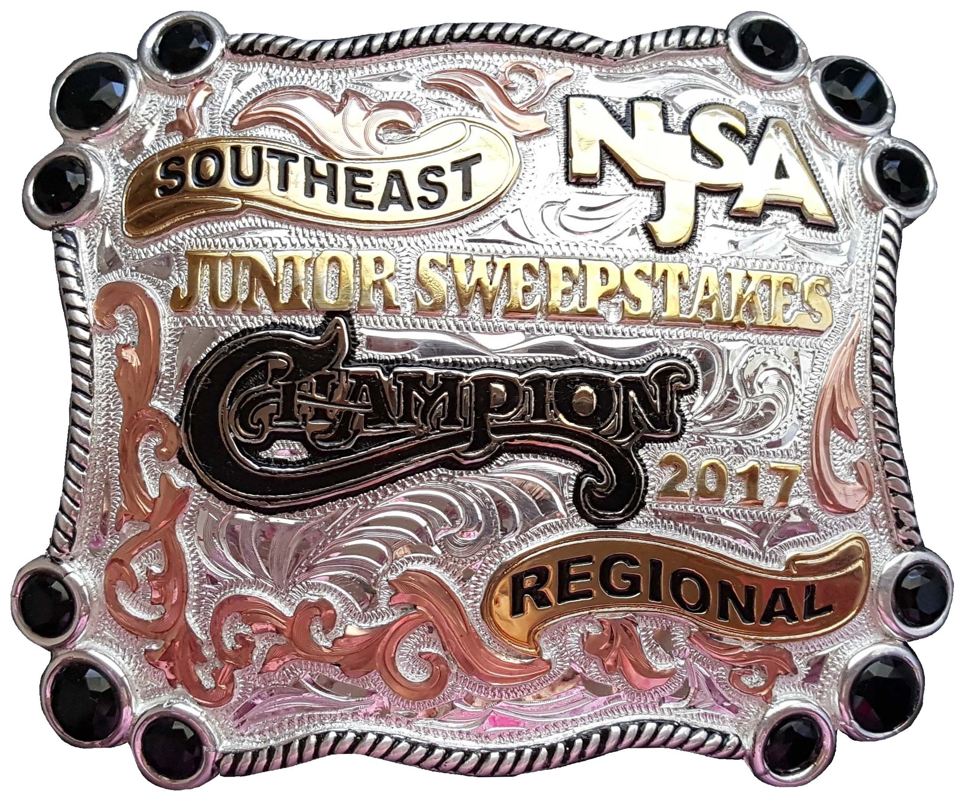 Square buckle with silver rope design edge and black stones. Silver swirled background with gold and black lettering and copper swirls.